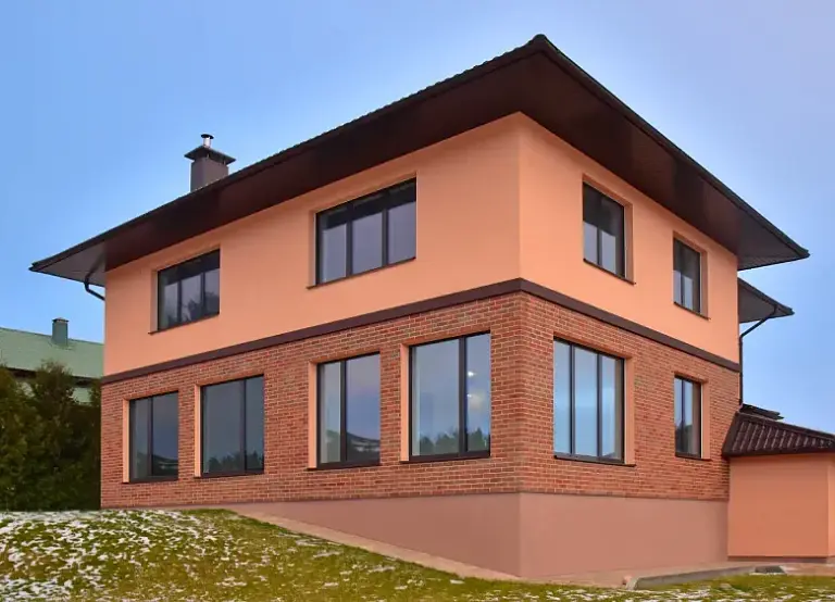 Преимущество скрытой створки заключается в том, что она остается незаметной. Благодаря чему экстерьер частного дома выглядит лаконично и современно.